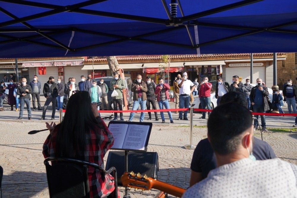 Diyarbakır Büyükşehir Belediyesi, korona virüs salgını nedeniyle kapalı ortamlarda gerçekleştirilmeyen etkinlikleri sokağa taşıdı. Kültür ve Sosyal İşler Dairesi Başkanlığına bağlı Kent Konservatuarı sanatçıları, 'Küçede sanat var' adıyla düzenledikleri etkinlikle vatandaşları canlı müzikle buluşturdu. Sur ilçesi Mardinkapı'da bulunan Büyükşehir Belediyesi turizm bürosu yanında gerçekleştirilen canlı müzik etkinliğine vatandaşlar yoğun ilgi gösterdi. Korona virüs tedbirleri kapsamında maske, mesafe ve temizlik kuralları en üst seviyede tutuldu. Vatandaşlar, sanatçılar tarafından seslendirilen şarkılara alkışlarla eşlik ettiler. Sık sık sosyal mesafe ve maske uyarıları da yapan sanatçılar, korona virüsten korunmak için vatandaşların her zaman tedbir almasını istedi.