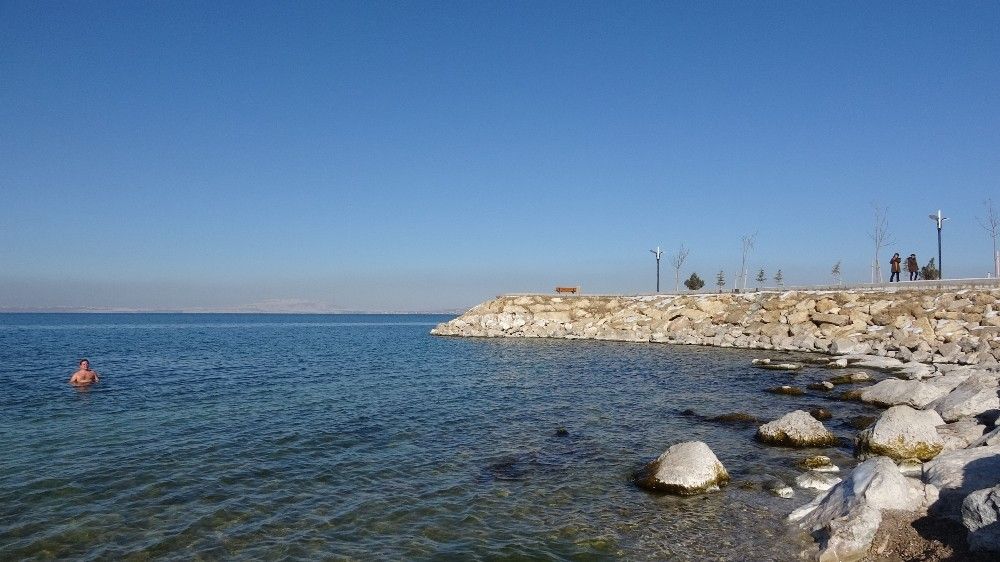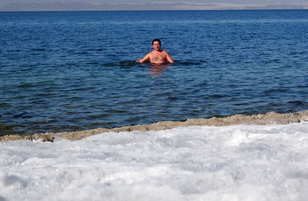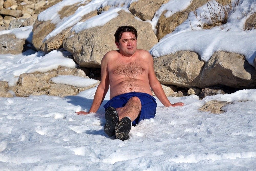 Van'da görev yapan Acil Tıp Uzmanı Dr. Mehmet Tatlı, dondurucu havada Van Gölü'nde yüzdükten sonra kar üstünde güneşlenmesi görenleri şaşırtıyor.