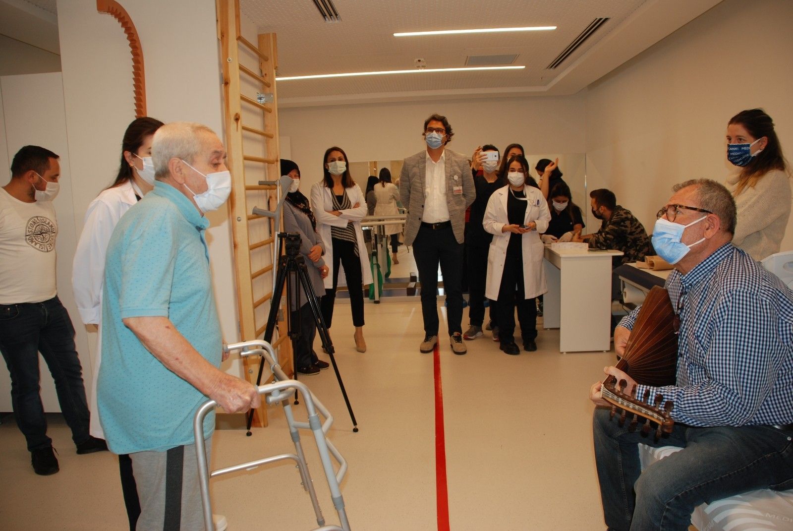 İzmir'de yaşayan emekli bankacı 75 yaşındaki Bekir Hacıoğlu, bacaklarda kuvvetsizlik ve yürüyememe şikayetiyle 2 ay önce özel hastaneye başvurdu. Yapılan tetkiklerde, Hacıoğlu'nun omurgasında enfeksiyon ve tüberküloza bağlı apse olduğu saptandı. İki zorlu cerrahi ameliyat geçiren Hacıoğlu, daha sonra fizik tedavi bölümüne yönlendirildi. Tedavi sürecinde motivasyonunu hiç düşürmeyen Hacıoğlu, tedavisini yapan hekim ve fizyoterapistlere de pozitif enerji verdi. Şarkı ve türküler söyleyerek ayağa kalkıp destekle de olsa yürümeye başlayan Hacıoğlu, sağlık durumundaki iyileşmeyi şarkı söyleyerek kutladı. Beyin Cerrahisi Uzmanı Prof. Dr. Mehmet Şenoğlu, Fizik Tedavi Uzmanı Doç. Dr. Aslı Çalışkan, Fizyoterapist Gizem Acar ve Hacıoğlu'nun eşi Münevver Hacıoğlu, Hacıoğlu'nun şarkılarına eşlik ederken, Fizik Tedavi Uzmanı Prof. Dr. Ömer Faruk Şendur da udunu konuşturdu.