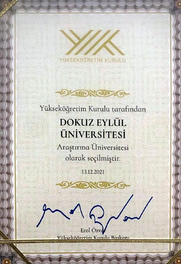 DEÜ, 131'i devlet üniversitesi olmak üzere toplamda 207 üniversite arasında ilk 15'e girmeyi başardı. Yükseköğretim Kurulu (YÖK) tarafından yürütülen Araştırma Odaklı Misyon Farklılaşması Programı kapsamında alınan yeni kararların duyurulduğu Araştırma Üniversiteleri Toplantısı Ankara'da gerçekleştirildi. Sanayi ve Teknoloji Bakanı Mustafa Varank'ın da katıldığı toplantıda Araştırma Odaklı Misyon Farklılaşması programında yapılan değişiklik ile 20 devlet üniversitesi ve 3 vakıf üniversitesinin araştırma üniversitesi olduğu açıklandı. Dokuz Eylül Üniversitesi de 'araştırma üniversitesi' olmaya hak kazanan üniversiteler arasındaki ilk 15 üniversite arasındaki yerini alırken, DEÜ Rektörü Prof. Dr. Nükhet Hotar'a 'Araştırma Üniversitesi Beratı'nı Sanayi ve Teknoloji Bakanı Mustafa Varank ve YÖK Başkanı Prof. Dr. Erol Özvar verdi.