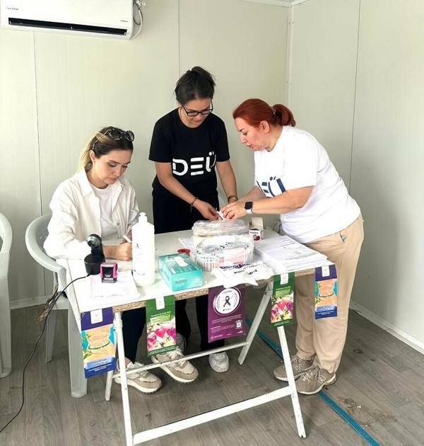 DEÜ Rektörü Prof. Dr. Nükhet Hotar'ın talimatıyla deprem bölgesine giderek deri hastalıkları, bulaşıcı hastalıkların önlenmesi, deri kanserleri ve güneşten korunma ile ilgili eğitim verdiklerini ve çeşitli sağlık tarama testleri gerçekleştirdiklerini aktaran DEÜ Kozmetoloji Uygulama ve Araştırma Merkezi Öğretim Üyesi Doç. Dr. Özlem Bağçıvan ise şunları kaydetti: "Sıcakların artmasıyla beraber cilt rahatsızlıklarında ciddi bir artış gözlemlenmeye başladı. Biz de çocukları ve bölge halkını sağlık tarama testinden geçirerek uygun tedavi yollarını planlamaya başladık. Bölgedeki afet sonrası oluşabilecek virüs, bakteri, mantar ve paraziter hastalıkların taraması ve önlenmesine ek olarak kronik deri hastalıkları bulunan bireylerin muayenesi de gerçekleştirerek tedavilerini planladık."