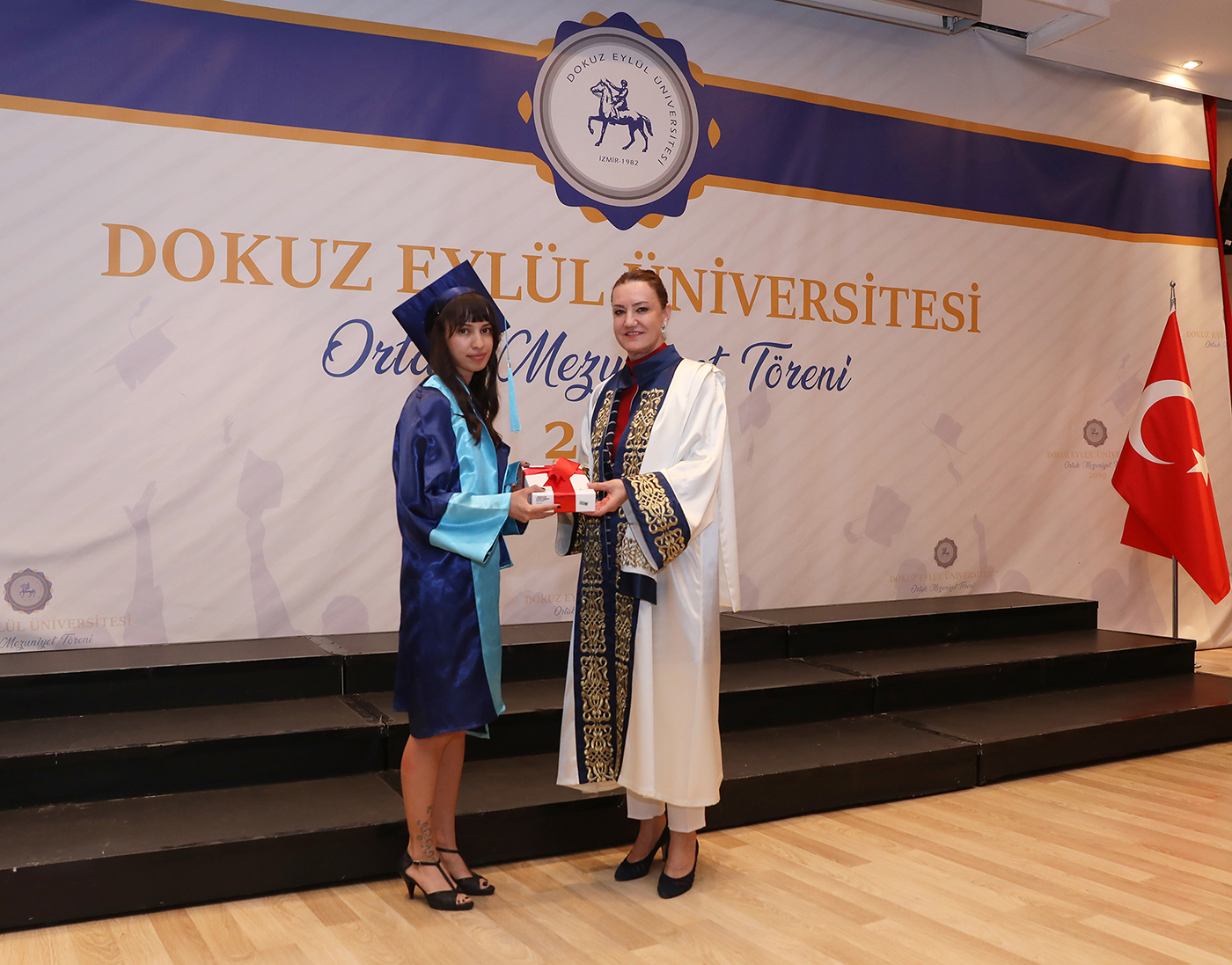 Dokuz Eylül Üniversitesi tarafından, 2018-2019 Akademik yılında üniversitenin çeşitli Fakülte, Yüksekokul ve Meslek Yüksekokullarından dereceyle mezun olan öğrenciler için “Ortak Mezuniyet Töreni” düzenlendi. Devlet Konservatuvarı sanatçılarının konseriyle başlayan etkinlikte; bölümlerini dereceyle bitiren öğrencilere; eğitim gördükleri bölümlerin yönetici öğretim üyeleri tarafından çeşitli hediyeler verildi. 2018 – 2019 akademik yılında 100 tam puanla DEÜ’yü birincilikle tamamlayan Fen Fakültesi Bilgisayar Bilimleri Bölümü mezunu Gökçe Önen’e hediyesini DEÜ Rektörü Prof. Dr. Nükhet Hotar takdim etti.