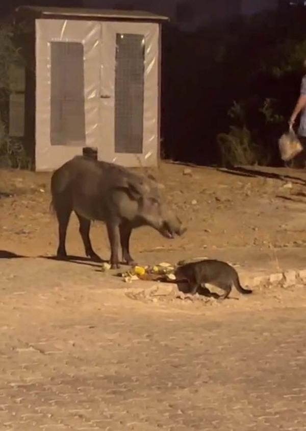 MUĞLA'nın turistlik ilçesi Marmaris'te yiyecek aramak için ilçe merkezine inen bir yaban domuzu, yol kenarında bırakılan yemek artıklarını yiyen kedinin yemeğine ortak oldu. O anlar, cep telefonu kamerasıyla görüntülendi.
