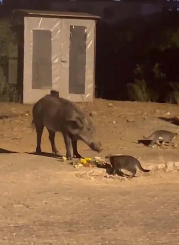 Marmaris ilçesinde aç kaldığı için yiyecek aramaya inen yaban domuzlarından biri, yol kenarına bırakılan yemek artıklarını yiyen bir kedinin yemeğine ortak oldu. Domuz ve kedinin birlikte yemek yediği anlar bir vatandaş tarafından cep telefonu kamerasıyla görüntülendi.