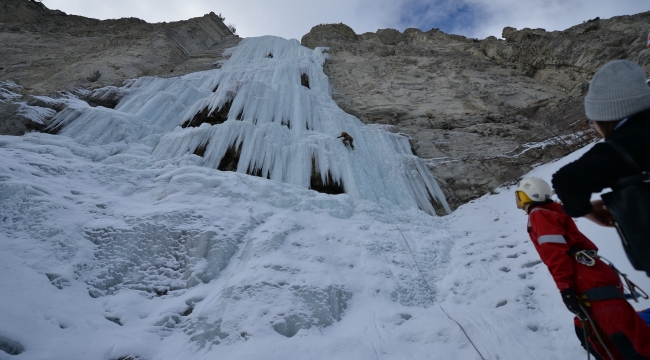 Donmuş şelaleye tırmandılar