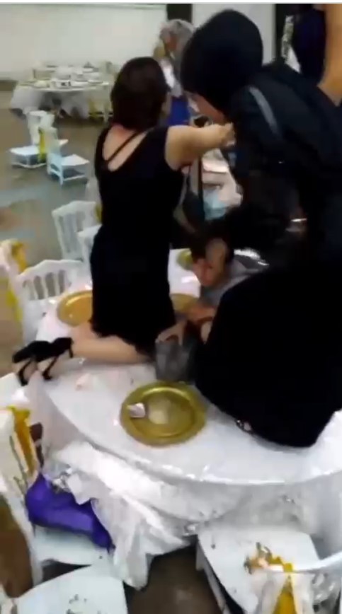 Düğünün başlamasına kısa bir süre kala salonu dolduran sel suları sebebiyle misafirler, çocuklarıyla birlikte sandalyelerin sürüklendiği salonda masalara çıkarak kendilerini korumaya çalıştı.