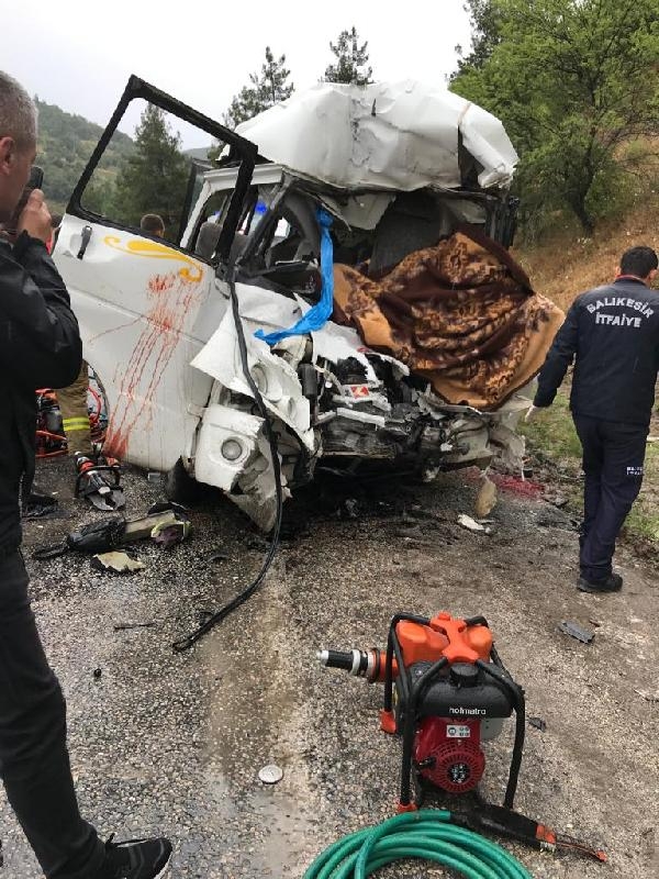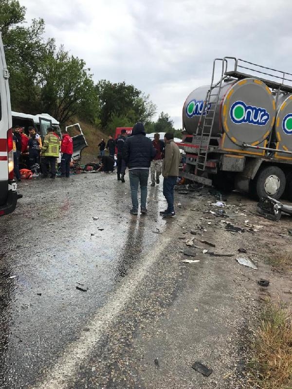 BALIKESİR'in Dursunbey ilçesinde düğüne gidenlerin içinde bulunduğu minibüs ile süt taşıma tankerinin kafa kafaya çarpıştığı kazada 8 kişi öldü, 10 kişi de yaralandı.