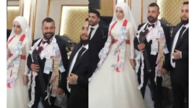 Takı merasimi başladığı esnada damadın arkadaşlarından biri kırmızı kurdele ile bağladığı silahı damadın boynundan geçirdi. Merasim sunumunu yapan kişi ise, “Şeytan doldurmasın, şu şekilde güzel bir alkış alabilir miyiz?” demesiyle salonda büyük alkış koptu.
