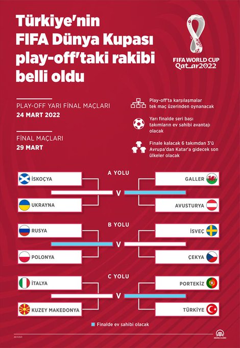 A Milli Futbol Takımı, FIFA 2022 Dünya Kupası Avrupa Elemeleri Play-Off Turu'nda C Yolu'na düştü ve yarı finaldeki rakibi Portekiz oldu. Milliler, yarı finalde tur atlaması halinde finalde İtalya - Kuzey Makedonya maçının galibiyle kendi sahasında karşılaşacak.