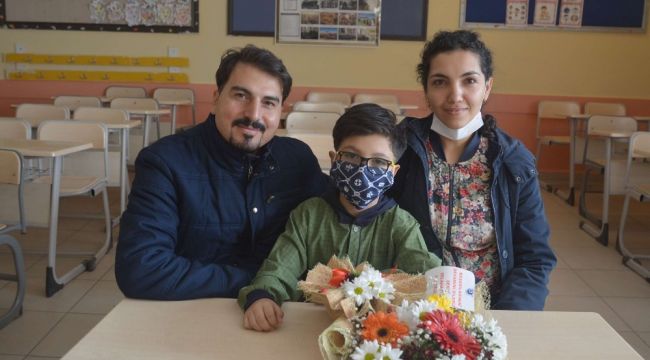 Yusuf'a çiçek takdim eden ve bugünde doğum günü olduğunu söyleyen Korkmaz, "Dünya çapında 2 bin 557 öğrenci arasında öğretmen gözetiminde yapılan Kanada Merkezli Caribou Matematik Organizasyonunda tüm soruları yanıtlayarak şampiyon olmuştur" şeklinde konuştu