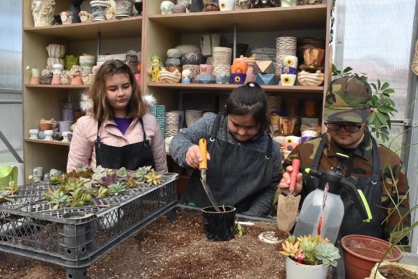 Bornova Hasan Tahsin Özel Eğitim Mesleki Eğitim Merkezi'nde bir tarım atölyesi kuran öğretmen Adem Erhan da down sendromlu çocukların toprağa dokunarak rehabilite olduğunu söyleyip "Atölyemizde hafif zihinsel engelli çocuklarımızla çalışıyoruz. Toprakla, bitkilerle uğraşmak onları rehabilite ediyor. Burayı çok seviyorlar. Burada çalıştığımız bitkiler özel bitkilerdir. Kaktüs, sukulent gibi bitkilerle çalışıyoruz. Bu bitkiler hatalara karşı toleranslı bitkiler. Bizim öğrencilerimiz de biraz fazla hata yapsalar bile o bitkiler onları affediyorlar. Burada hayal güçlerine uygun şekilde tasarımlar yapıyorlar. Toprağa dokunmak onlara çok iyi geliyor" diye konuştu. Down sendromlu öğrencilerden Umut Gökçeoğlu (19) da "Okulumu öğretmenlerimi çok seviyorum. Tarımda çiçek dikiyoruz" dedi. (DHA)
