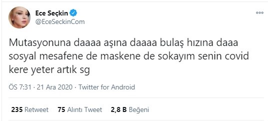 Son dönemde koronavirüsün mutasyona uğradığının heberlerinin çıkması toplumda endişe yaratırken şarkıcı Ece Seçkin bu konuda küfürlü bir paylaşımda bulundu. Seçkin, bu paylaşımı sonrası kimilerinden tepki alırken, kimi takipçilerinden de destek buldu. İşte o küfürlü paylaşım şöyle: