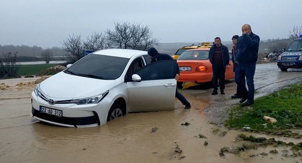 Edirne'de şiddetini artırarak devam eden sağanak yağış sebebiyle birçok araç mahsur kaldı, bazı araçlar da trafikte ilerlemekte güçlük çekti.