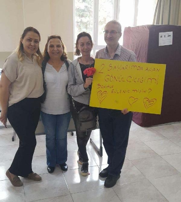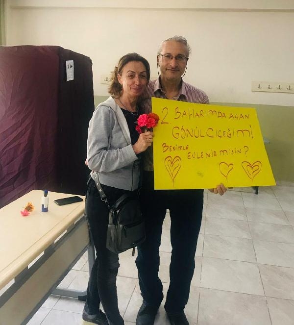 BALIKESİR'in Edremit ilçesindeki bir okulda sandıkta gözlemci olan Ergün Gökçek (60), kendisi gibi başka bir okulda gönüllü gözlemci olan Aslı Ener'e (55) sandık başında sürpriz evlilik teklifi yaptı.