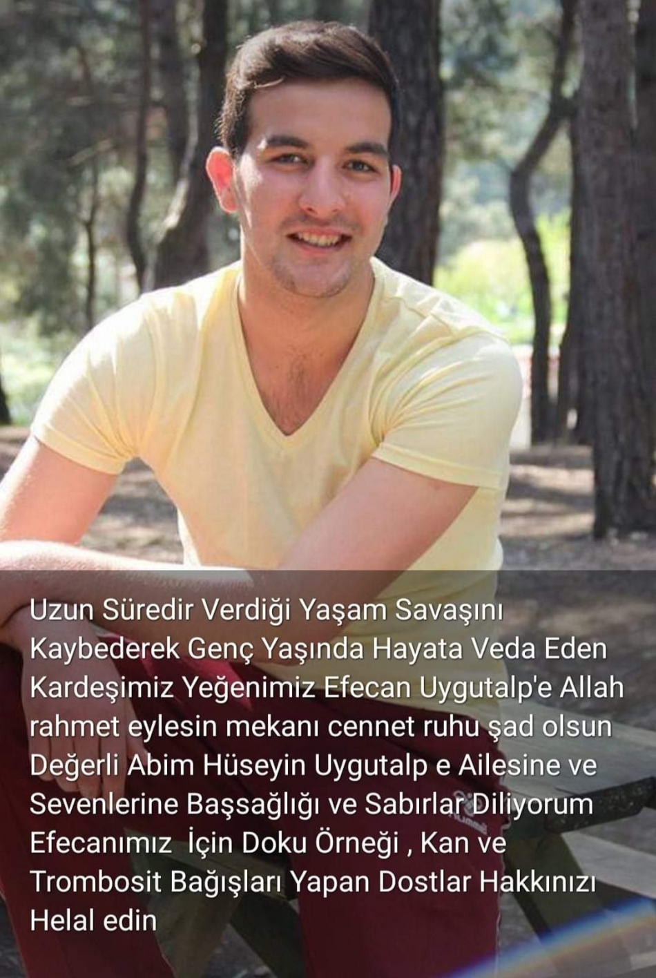 Pınarbaşı semti Kemalpaşa Mahallesi eski Muhtarı ve CHP ilçe yöneticisi Hüseyin Uygutalp'ın sevgili oğlu Efecan uzun zamandır Ege Üniversitesi Tıp Fakültesi Hastanesin'de tedavi altındaydı.
