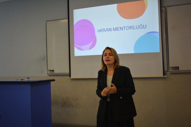 EÜ Mühendislik Fakültesi İnşaat Mühendisliği Bölümü dersliklerinde gerçekleştirilen etkinlikte, 3. sınıf öğrencisi Serhan Sarp Bolsoy, akran mentörlüğü sürecinde edindiği deneyimleri katılımcılarla paylaştı. Bolsoy, mentörlüğün yalnızca bir görev değil, aynı zamanda bir gönül bağı olduğunu belirterek, mentisiyle birlikte kaydettikleri sosyal ve akademik gelişmeleri aktardı.