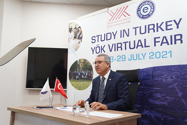 Sanal Fuarda aday öğrencilerle bir araya gelen Ege Üniversitesi Rektörü Prof. Dr. Necdet Budak, Ege Üniversitesi’nde kampüs yaşamından, eğitim olanaklarına, barınma ve yiyecek ihtiyaçlarından, akademik ve öğrenci yaşamına dair birçok konu hakkında bilgi verdi. Rektör Budak, “Ülkemizin Yükseköğretiminin uluslararası düzeyde yakaladığı başarıyı desteklemek amacıyla online gerçekleştirilen ‘Study in Turkey 2021 YÖK Sanal Fuarı’nda üniversitemizi her yönüyle tanıttık” dedi.