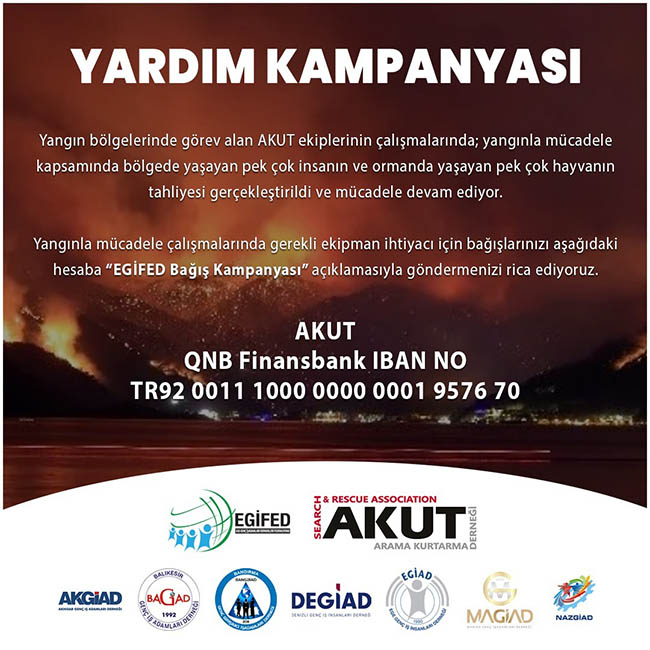 Konuyla ilgili üyelerine çağrıda bulunan EGİFED Yönetim Kurulu Başkanı Aydın Buğra İlter, kampanyaya katılımın büyük önem taşıdığını belirterek, “Operasyonlara katılan ve büyük bir iş birliğiyle çalışan tüm ekipler ve sivil toplum kuruluşları insan üstü bir varlık göstermiştir. Yangın felaketi ile boğuşan tüm il ve ilçe sakinlerimize geçmiş olsun. Vefat edenlerin ailelerine başsağlığı diliyoruz. Son günlerde yaşanan, insan, hayvan, ağaç ve birçok canı kaybettiğimiz yangın felaketlerinde daha büyük kayıplar yaşamamak adına AKUT var gücüyle bölgede faaliyette bulunmuştur. Deprem, yangın, sel tüm felaketlerde her daim yanımızda olan sivil toplum örgütü AKUT’a destek olarak felaket yaşadığımız bölgelere yardımımızı iletmek istedik. Yangınla mücadelede ekipman ihtiyacının karşılanması için AKUT’a destekte bulunacağız” dedi.