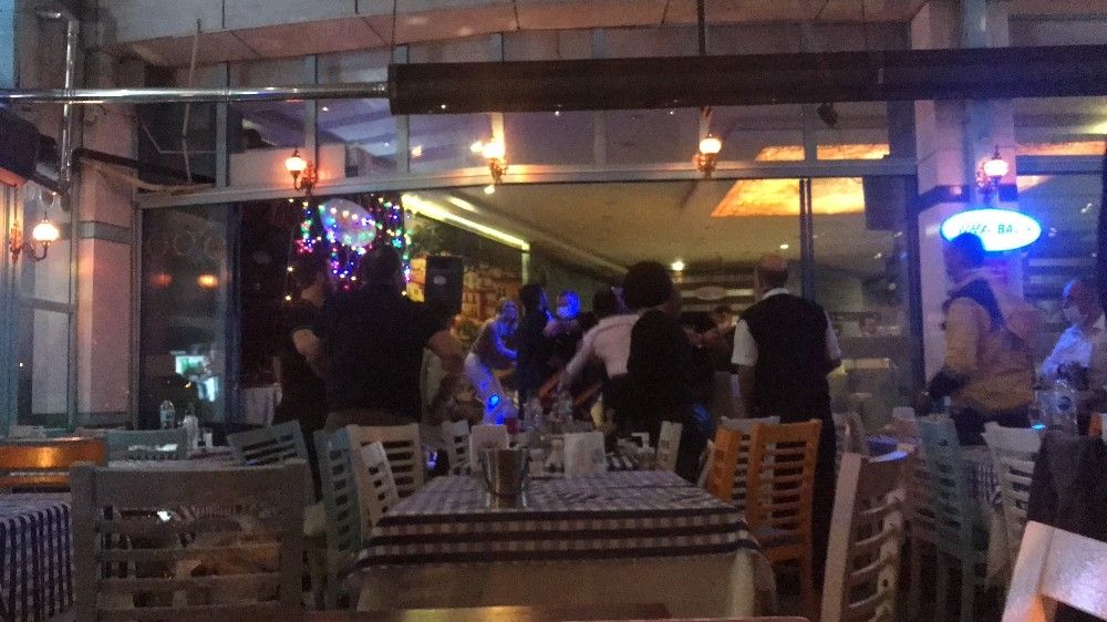 Bu sırada tartışma yaşanan masanın arkasında oturan bir kişi, "Neden bağırıyorsun, hesabını öde çek git " diyerek, tepkisini dile getirince bu sefer ikili arasında tartışma çıktı. Tartışmanın kısa sürede büyüyüp, kavgaya dönüşmesi üzerine ikili, sandalye, şişe ve yumruklarla birbirini darp etti. Diğer müşterilerin de araya girmesiyle kavgada ortalık savaş alanına döndü.