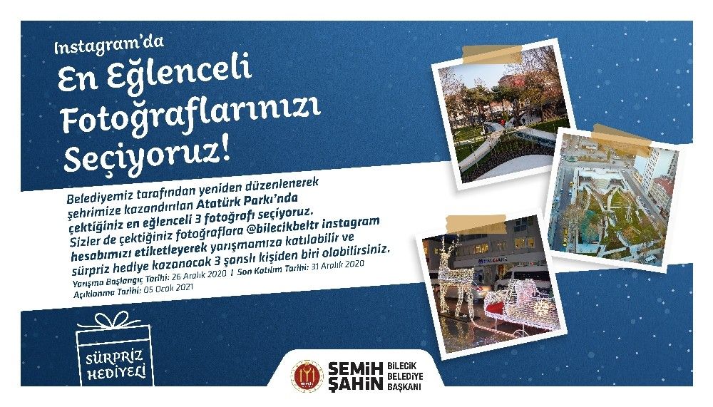 Bilecik Belediyesi tarafından yeniden düzenlenerek şehre kazandırılan Atatürk Parkı'nda vatandaşların çekeceği en eğlenceli 3 adet fotoğraf seçilerek, belediye sosyal medya organlarında paylaşılacak. Bilecikliler, "En Eğlenceli Fotoğraflarınızı Seçiyoruz" sloganı ile hazırlanan aktiviteye katılarak şanslı üç kişiden biri olabilecek. Yarışma başlangıç tarihi 26 Aralık 2020, son katılım tarihi ise 31 Aralık olacak ve sonuçlar 5 Ocak 2021 tarihinde açıklanacak.