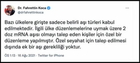 Bazı ülkelere girişte sadece belirli aşı türleri kabul edilmektedir. İlgili ülke düzenlemelerine uymak üzere 2 doz mRNA aşısı olmayı talep eden kişiler için özel bir düzenleme yapılmıştır. Özel seyahat için talep edilmesi dışında ek bir aşı gerekliliği yoktur'' ifadelerini kullandı.