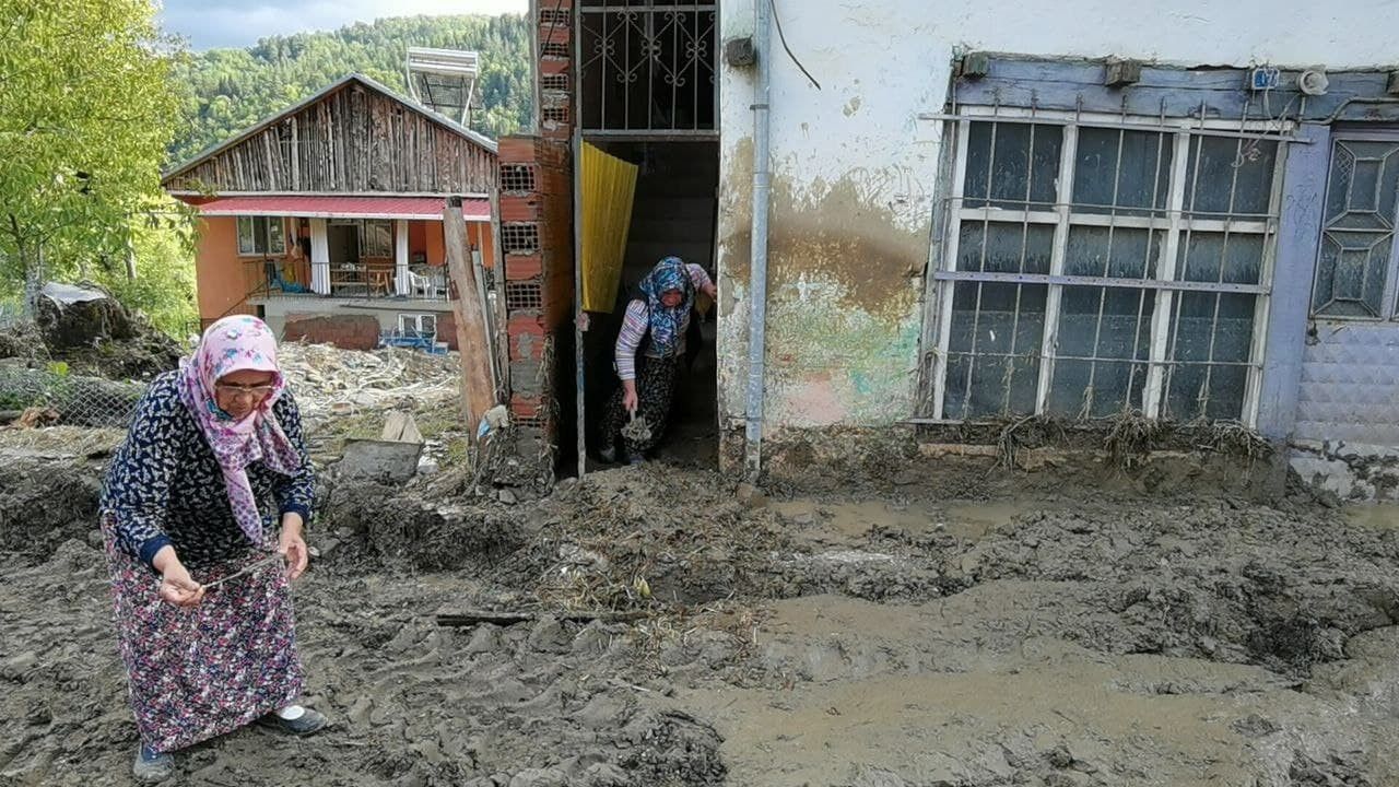 Ayşe Ünal ve ailesi adeta çamura bürünen eşyalarını ve evini temizlemek için çalışmalarını sürdürüyor.