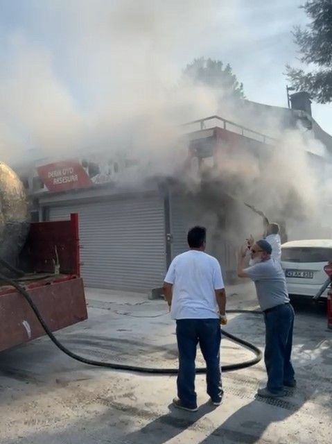 Kocaeli'nin İzmit ilçesinde bir iş yerinde çıkan yangını söndürmeye çalışan vatandaşlar, alevlere hortum ve yangın tüpleri ile müdahale etti.