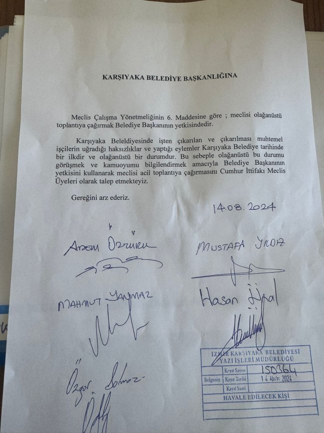 Sorunun ivedilikle çözülmesi adına, Karşıyaka belediyesi Cumhur İttifakı meclis üyeleri, Karşıyaka belediye başkanı Behice Yıldız Ünsal'ı meclisi olağanüstü toplamaya çağırdılar!