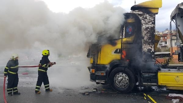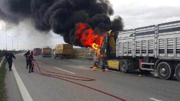 İzmir otoyolunda kamyona arkadan çarpan TIR alev aldı. Şoför son anda alev alan TIR'dan atlayarak yanmaktan kurtulurken, yangın itfaiye ekiplerince söndürüldü.