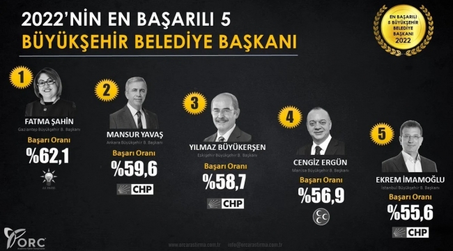ORC araştırma, 2022'nin en başarılı belediye başkanları anketi yayınlandı. Büyükşehirler içerisinde Fatma Şahin birinci sırada yer alırken, Ekrem İmamoğlu son sırada yer aldı.