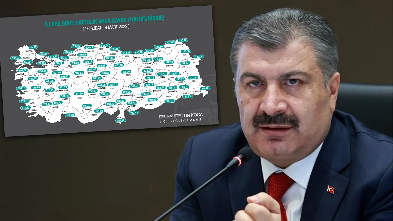 Koca, söz konusu paylaşımında, "26 Şubat-4 Mart arasında, 100 bin kişi içinde bir haftalık toplam yeni Covid-19 vaka sayısı il bazında neydi? Yaşadığınız, gidip geldiğiniz ildeki durumu haftalık İnsidans haritamızdan öğrenebilirsiniz" ifadelerini kullandı.