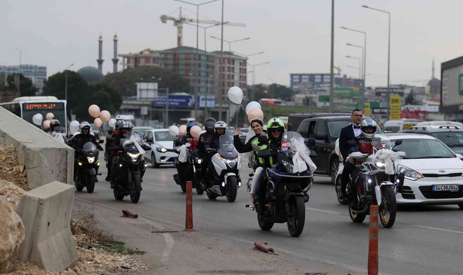 Bursa'da gelini almaya motosikletle giden damat, görenleri hayrete düşürdü. 4 yıl önce tanışan Burak Keleşoğlu (33) ile Bahar Bulut (30) çiftinin tek hayali motosiklet almak ve dünya turu atmaktı. Kendisi gibi motosiklet tutkunu sevgilisine sürpriz yapmak isteyen Burak, düğün konvoyunu motosikletle yapmak için arayışa girdi. Bursa Motosiklet Derneği ile birlikte eşi olacak Bahar'a düğün sürprizi yapan Burak, balonlarla süslenen motosikletlerle gelin evine geldi. Damat ve arkadaşlarını motosikletle gören herkes şaşkına döndü. Çalan davul ve zurna eşliğinde karşılıklı oynayan gelin ve damat, motosikletlere binip nikah salonunun yolunu tuttu. Gelinlik yerine motosiklete uygun beyaz kıyafet giyinen gelinin topuklu ayakkabılarından ise vazgeçmemesi dikkat çekti.