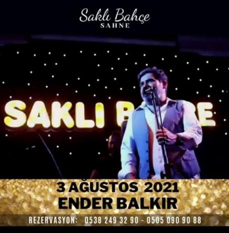 İzmir’in en özel mekanlarından olan, doğallığı güzelliği ile hayran bırakan Saklı Bahçe’de 3 Ağustos akşamı Ender Balkır rüzgarı esecek. Sanatçı Balkır, muhteşem bir atmosferde, nezih bir ortamda enfes lezzetler eşliğinde keyifli bir akşam yaşatacak.