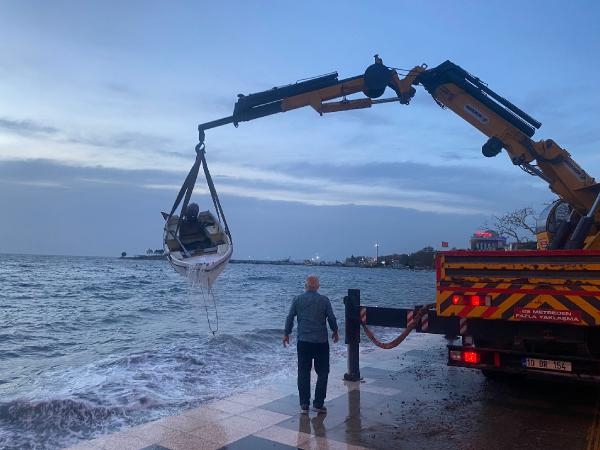 Balıkesir'in Erdek ilçesinde etkili olan lodos günlük yaşamı olumsuz etkilerken, denizde dev dalgalar meydana geldi, batmak üzere olan tekneler, sahipleri tarafından vinçle kurtarıldı.
