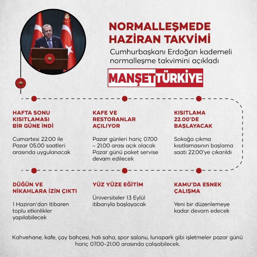 Haziran ayı boyunca sokağa çıkma sınırlamaları hafta içi ve cumartesi günü akşam 22.00 ile sabah 05.00 saatleri arasında uygulanmaya devam edecektir.
