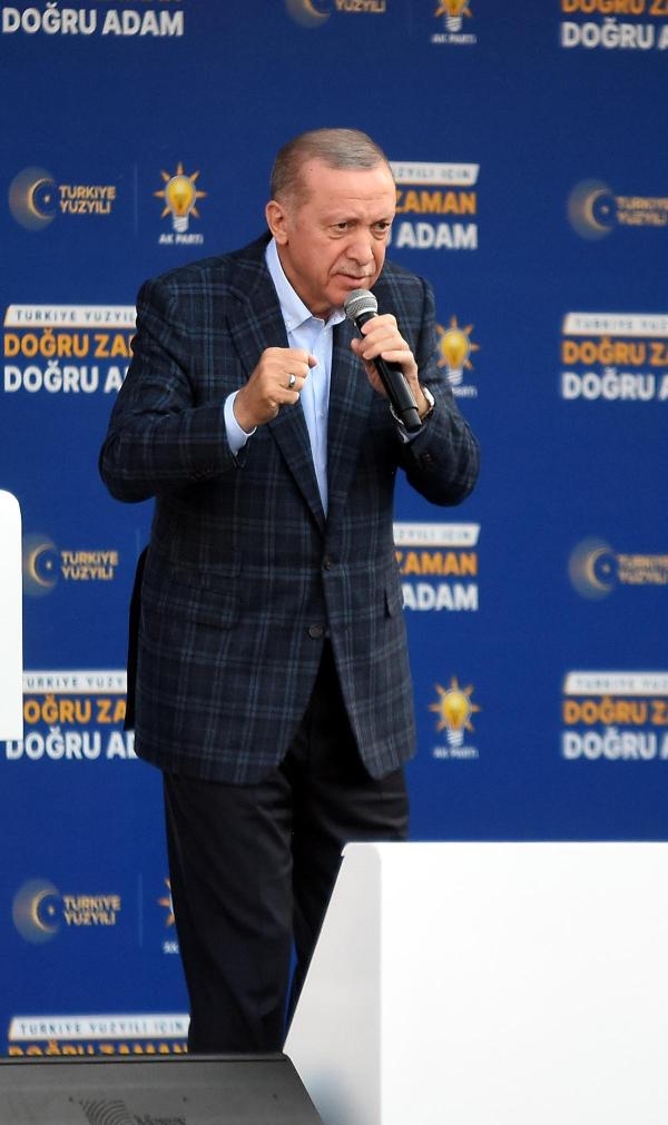 Konuşmasına devam eden Cumhurbaşkanı Erdoğan, "Sırf uzantılarının siyasi desteğini alabilmek için milletimizin güvenliğini devletimizin bekasını tehlikeye atma pahasına PKK'dan, FETÖ'ye tüm terör örgütlerine göz kırpıyorlar. Kandil'den her gün Kılıçdaroğlu'nun cumhurbaşkanlığını destekleme açıklamaları geliyor. Terörist başı, 'Kılıçdaroğlu'nun adaylığını açıklayacağız' diyor. Söyle bana arkadaşını söyleyeyim sana kim olduğunu. Arkadaşı Kandil olanlara benim milletim destek verir mi? Bu ittifak boşuna mı? Öyleyse bunu bozacağız. Yurt içindeki ve yurt dışındaki FETÖ'cüler, milletin ve devletin başına çökmek için boşuna mı seçim gününü bekliyor. Türkiye'nin artık kendilerini dinlemediğini söyleyen emperyalistler boşuna mı ellerindeki mecraları Kılıçdaroğlu'nun, İnce'nin, CHP'nin başını çektiği ittifakın emrine veriyor. Ülkemizi diledikleri gibi soyamayan Londra tefecileri, boşuna mı umutlarını Kılıçdaroğlu'na bağladı. Kardeşlerim hadi terör örgütleri ve dışardaki güçler kendi çıkarları için umutlarını Kılıçdaroğlu'na bağladılar diyelim, peki bu ülkenin ekmeğini yiyip, suyunu içen, havasını soluyan her türlü imkanından herkesten daha fazla yararlanan bazılarına ne oluyor. Ülkemiz kendi doğal gazını çıkarıyor bunlar rahatsız oluyor. Ülkemiz kendi savunma sanayi ürünlerini, teknolojilerini geliştiriyor bunlar rahatsız oluyor. Ülkemiz sınırları ötesinde hareketler düzenliyor, terör örgütlerini inlerinde vuruyor, bunlar rahatsız oluyor. Bunları ancak biz vururuz, biz. Bay bay Kemal onlarla resim çektiriyor. Bay bay Kemal'in yanındakiler onlarla Kandil'de resim çektiriyor. Sevgili milletim bunlara oy vermez. 14 Mayıs'ta da vermeyecek. Ülkemiz üretimini, ihracatını, istihdamını arttırıyor bunlar rahatsız oluyor. Ülkemiz asrın felaketi depremlerin yıkımlarını kısa sürede kaldırıp inşa ettiği konutları teslim aşamasına getiriyor, bunlar rahatsız oluyor. Ülkemiz afet risklerine karşı Cumhuriyet tarihin en büyük dönüşüm kampanyalarını başlatıyor bunlar rahatsız oluyor. Yaptığımız üniversiteler, şehir hastaneleri, yollar, tünellere, havalimanlarına, barajlara, fabrikalara, spor tesislerine karşı sergilediği hazımsızlığı saymıyoruz" dedi.