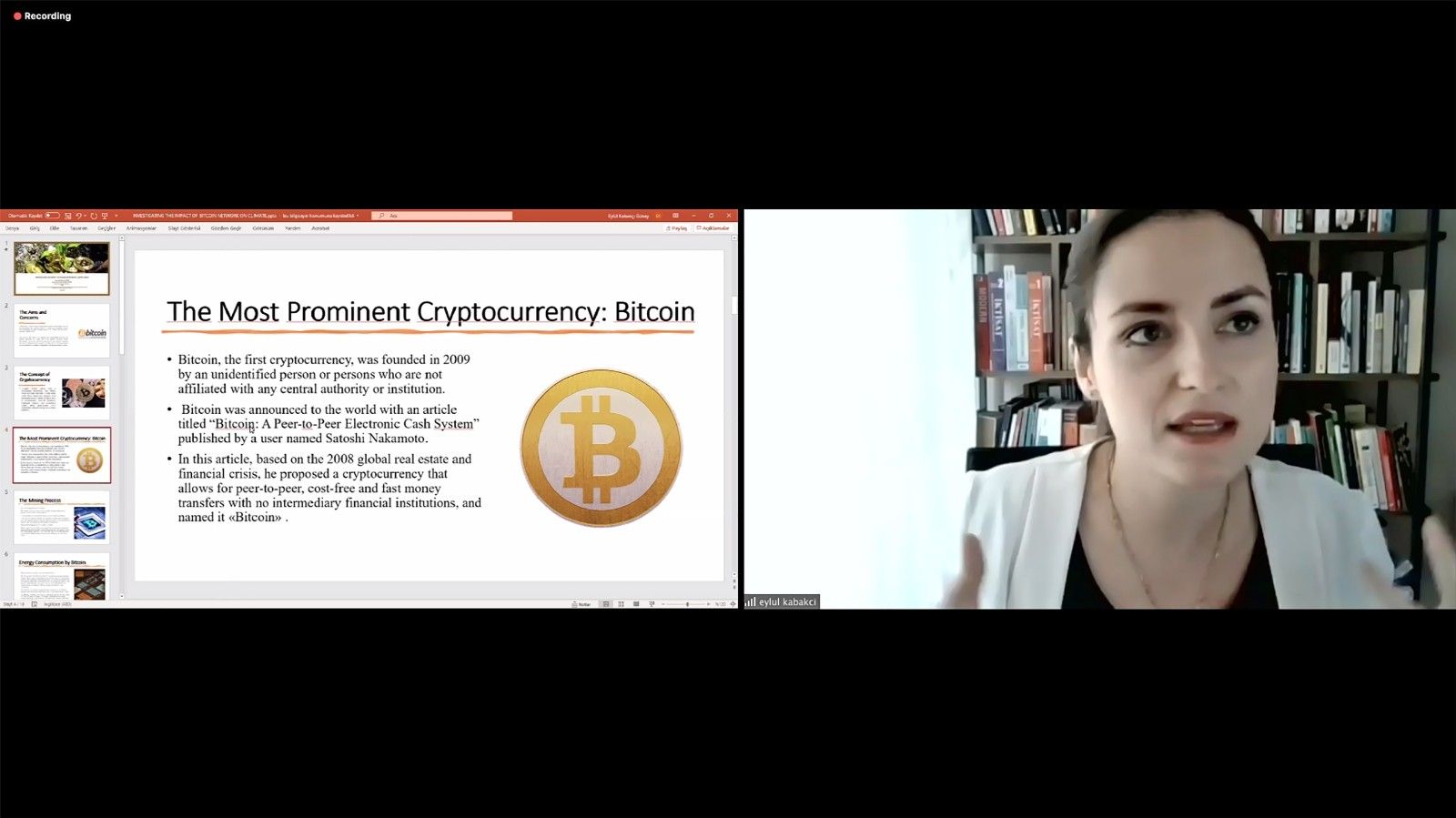 Yaşar Üniversitesi İşletme Fakültesi Uluslararası Ticaret ve Finansman Bölüm Başkanı Doç. Dr. Mehmet Umutlu'nun moderatörlük yaptığı bölümde ise İzmir Demokrasi Üniversitesi İktisat Bölümü Öğretim Üyesi Doç. Dr. Ferhan Sayın ve Dr. Öğretim Üyesi Eylül Kabakçı Günay'ın, "Bitcoin Ağının İklim Krizi Üzerindeki Etkisi" isimli araştırma sonuçları anlatıldı.