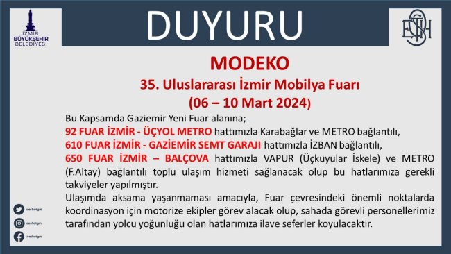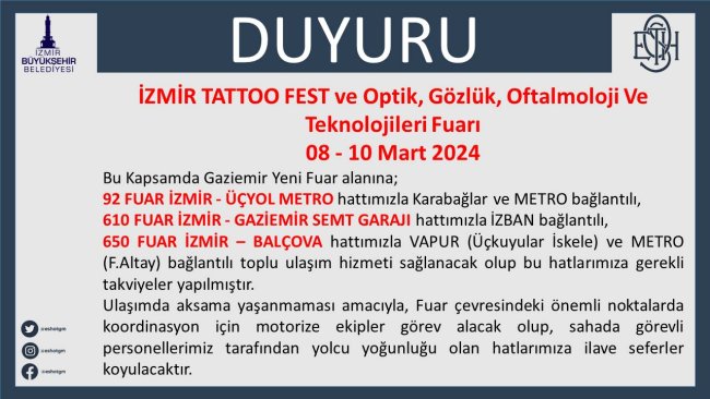 İzmir Büyükşehir Belediyesi, Fuar İzmir ev sahipliğinde 6 – 10 Mart 2024 tarihleri arasında düzenlenecek üç fuar organizasyonu için ulaşım düzenlemesine gitti. ESHOT Genel Müdürlüğü, Fuar İzmir’e giden otobüs hatlarına takviye yaptı. 8-10 Mart tarihleri arasında İZFAŞ tarafından düzenlenecek Optic World İzmir – Optik, Gözlük, Oftalmoloji ve Teknolojileri Fuarı, eş zamanlı Fuar İzmir’de düzenlenen İzmir Tattoo Fest ve 6-10 Mart 2024 tarihleri arasında düzenlenecek MODEKO 35. Uluslararası İzmir Mobilya Fuarı’na ziyaretçiler, 92 numaralı Fuar İzmir-Üçyol Metro hattı (Karabağlar ve Metro bağlantılı), 610 numaralı Fuar İzmir –Gaziemir Semt Garajı hattı (İZBAN bağlantılı), 650 Fuar İzmir- Balçova hattı (Üçkuyular İskele F.Altay metro bağlantılı) ESHOT otobüslerinden ulaşım sağlayabilecek.