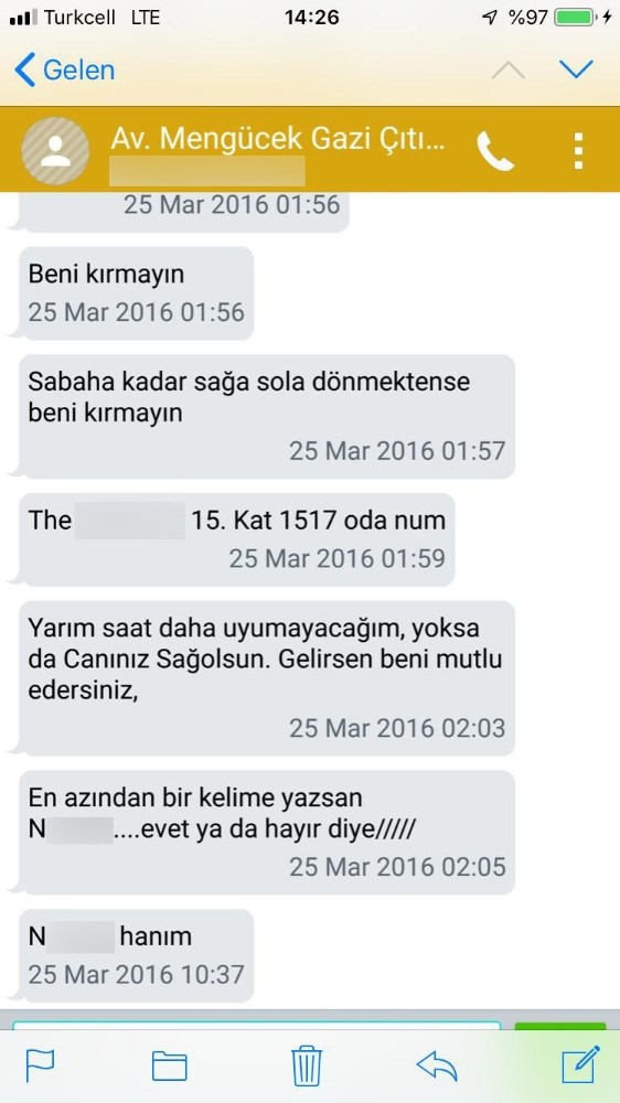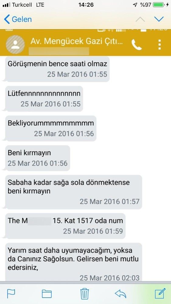 N.Ç. (50), 4 yıl önce İstanbul'da yaşarken anlaşamadığı eşi C.B.'den boşanmak için eski CHP Milletvekili Osman Çıtırık'ın oğlu eski Adana Barosu Başkanı Avukat Mengücek Gazi Çıtırık ile anlaştı. Boşanma davası sürerken iddiaya göre Çıtırık, N.Ç.'ye, gece saatlerinde, "T.M. isimli oteldeyim. Şu an kaldığım yer. 1517 oda numaralı. Çok rica ediyorum. Bu otel sorun olmaz. Çok memnun olurum. Mutlu edersiniz beni. Görüşmenin bence saati olmaz. Sabaha kadar sağa sola dönmektense beni kırmayın. Lütfen, bekliyorum" şeklinde mesajlar attı. N.Ç.'den cevap alamayan Çıtırık, bu sefer de gece 02.03'te, "Yarım saat daha uyumayacağım yoksa da canınız sağ olsun" şeklinde mesaj gönderdi.