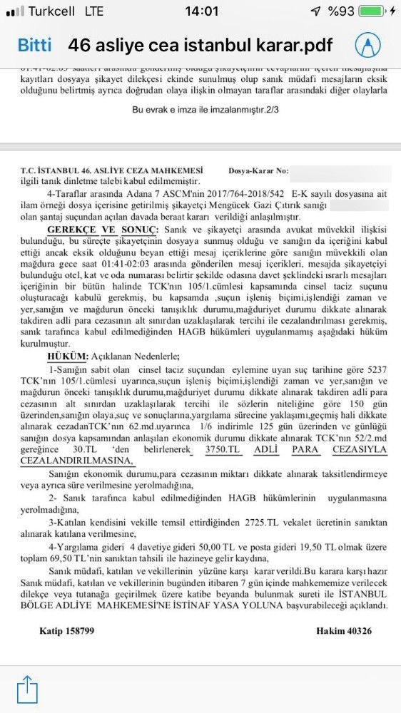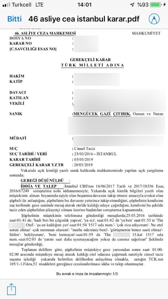 Bu mesajların ardından N.Ç., Mengücek Gazi Çıtırık hakkında İstanbul 46. Asliye Ceza Mahkemesi'nde cinsel taciz suçundan dava açtı. 2019 yılının Mart ayında ise davadan karar çıktı ve Çıtırık hakkında 125 gün hapis cezasına, ekonomik durumunun iyi olması nedeniyle de bu cezayı 3 bin 750 TL adli para cezası olarak ödemesine karar verildi. Ancak cezayı az bulan N.Ç., kararı istinafa taşıdı.