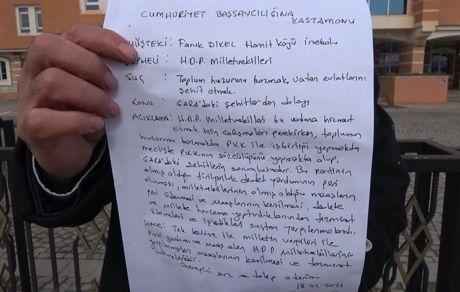 Kastamonu Cumhuriyet Başsavcılığına gelerek dilekçesini bırakan Faruk Dikel, dilekçesinin işleme alınmasını isteyerek, "13 şehidimizin sorumlusu, PKK'yı mecliste temsil eden HDP milletvekilleridir. Bu milletvekillerinin maaşlarının kesilmesi gerekir, bunlar devletten 57 milyon lira yardım almışlardır. Bu yardımların geri alınması gerekir. Ayrıca ilgili milletvekillerinin de yargılanması gerekir. Bunlar bu memlekete hainlik yapmaktadır. Esas vatan hainleri mağaralarda değil şu anda meclistedir. Türkiye'de yaşayan insanları buna destek vermeye davet ediyorum. Herkes bu partiden davacı olsun. Devletimizden aldıkları yardımları, milletvekillerinin aldıkları maaşları bizlere geri iade etsinler. Bu paralar gençlerimizin yeni iş imkanlar için kullanılsın" dedi.