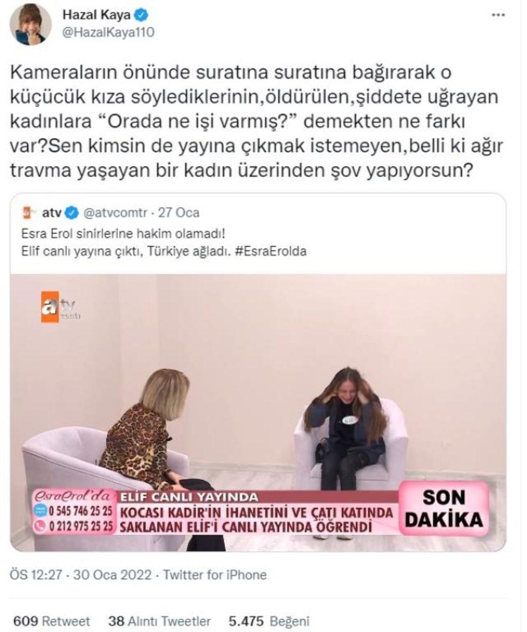 Hazal Kaya da tepki gösterenler arasındaydı. Kaya paylaşımında "Kameraların önünde suratına suratına bağırarak o küçücük kıza söylediklerinin, öldürülen, şiddete uğrayan kadınlara 'Orada ne işi varmış?' demekten ne farkı var? Sen kimsin de yayına çıkmak istemeyen, belli ki ağır travma yaşayan bir kadın üzerinden şov yapıyorsun?" dedi.