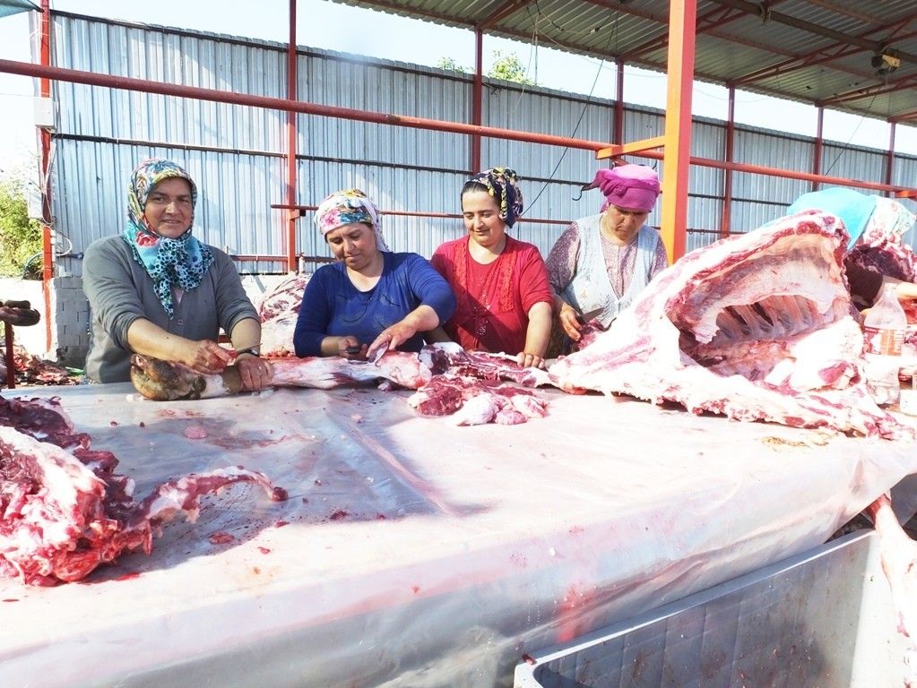 Balıkesir'in Burhaniye ilçesinde 21 noktada kurban kesimi yapılırken, kadınlar erkeklere kasaplıkta meydan okudu. Özellikle büyükbaş hayvanlar erkekler tarafından kesilip yüzülürken, kadınlarda etleri kemiklerinden ayırmada görev aldı.