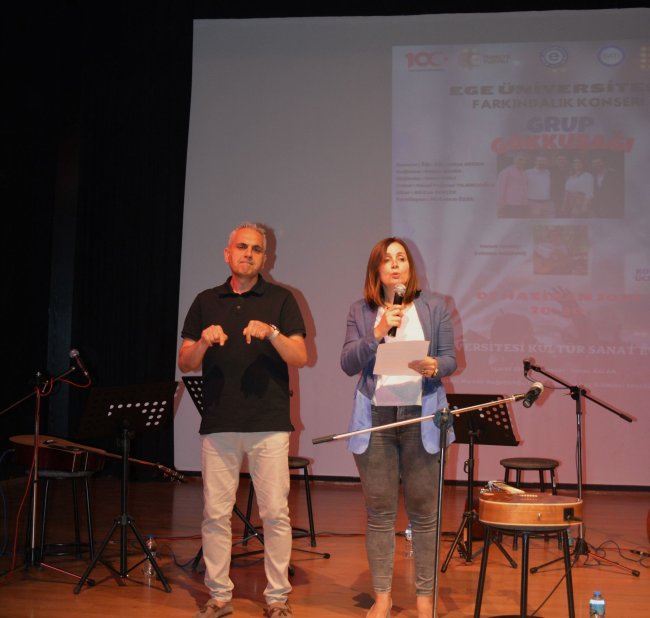 Fatma Paksoy- Fadwa Bettache- Ege Üniversitesi (EÜ) Madde Bağımlılığı, Toksikoloji ve İlaç Bilimleri Enstitüsü ve Engelsiz Ege Birimi Koordinatörlüğü işbirliğinde EÜ Kültür Sanat Evinde “Farkındalık Konseri” düzenlendi. Konserde Grup Gökkuşağı ve Sosyal Bilimler Enstitüsü Çevrebilimi Doktora Öğrencisi Şebnem Karakuş sahne aldı. Açılış konuşmasını Prof. Dr. Pelin Piştav Akmeşe’nin yaptığı Farkındalık konserinde, İşaret Dili Tercümanı Soner Aslan, konuşma boyunca Prof. Dr. Piştav Akmeşe’nin konuşmasını katılımcılara işaret dili ile tercüme etti.