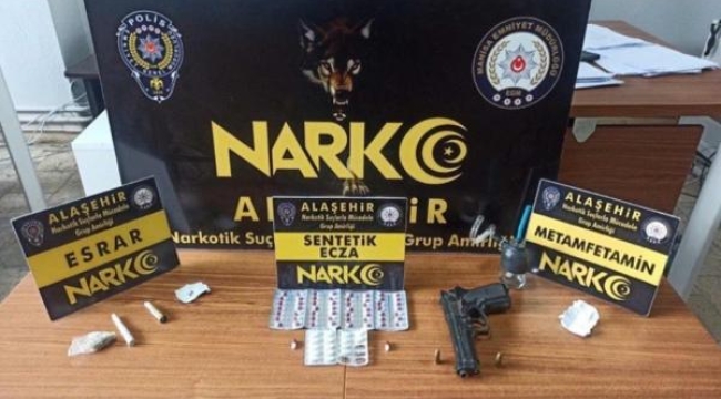 Manisa İl Emniyet Müdürlüğü Narkotik Suçlarla Mücadele Şube Müdürlüğü Alaşehir Büro Amirliği görevlileri, uyuşturucu veya uyarıcı madde imal edip, satan kişilere yönelik çalışma başlattı. Bu kapsamda 40 yaşındaki M.A.K.'ninh evinde uyuşturucu madde bulunduğu bilgisine ulaşıldı. Şüphelinin evine dün operasyon düzenlendi. Evde yapılan aramada, 74 adet sentetik ecza hap, 6,39 gram esrar, 0,34 gram metamfetamin 1 kurusıkı tabancayla, 2 mermi ve uyuşturucu kullanmaya yarayan bir aparat ele geçirildi. M.A.K., gözaltına alındı. Şüphelinin polisteki işlemlerinin sürdüğü bildirildi.(DHA)