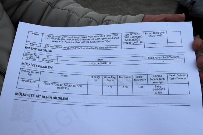 Tapu Müdürlüğünden alınan ‘ağır hasar kaydının' olduğunu anlatan Ufuk Özaydınlı, “Buraya imar verilmiyor. İmar verilmediği için müteahhitler de yapmaya yanaşmıyor. Evlerimiz başımıza yıkılmadan bu binaların yenilenmesini istiyoruz. Mağduruz. Evlerimize yıkılacak ümidiyle bir şey de yaptıramıyoruz. Doğal gazımız yok. Çocuğumuz sobalı odada oturuyor. Binaların bir çoğu çatlak. Başımıza yıkıldı yıkılacak. Binaların altında kalmak istemiyoruz. ‘Yılbaşından önce imzalar tamamlanacak' dediler. 31 Aralık'a kadar vekaletin süresi de doluyor. Bunun da yenilenmesi gerekecek. Kimse de yanaşmıyor. Bilgilendirme de yapılmıyor” şeklinde konuştu.