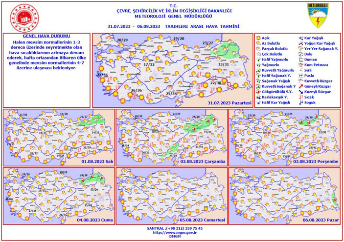Meteoroloji Genel Müdürlüğü de 31 Temmuz-5 Ağustos arası 5 günlük hava tahmininde ülke genelinde sıcaklıkların hafta içi mevsim normallerinin 4 ila 7 derece üstünde olacağını açıkladı. Açıklamada şu ifadelere yer verildi: