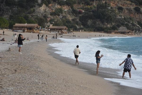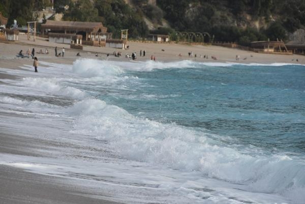 Türkiye'nin önemli turizm merkezlerinden biri olan Fethiye'de rüzgarlı havaya rağmen bazı yabancı turistler plaja gitmeyi tercih etti. Kentte hava sıcaklığı 23, deniz suyu sıcaklığı ise 22,2 derece ölçülürken öğleden sonra rüzgar kent genelinde etkili oldu. Bu kapsamda, Ölüdeniz Plajı'nda rüzgarlı havaya aldırış etmeyen yabancı turistler denizin keyfini çıkardı. Plaja vuran dalgaların boyu yer yer 2 metreye ulaşırken, küçük bir kızın deniz simidiyle tek başına yüzmesi dikkat çekti. Öte yandan, bazı yabancı turistler ise plajda oturup, fotoğraf çektirmeyi tercih etti. (DHA)