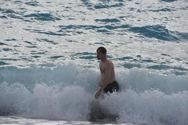 Fethiye'de yabancı turistler dalgalara rağmen denize girdi