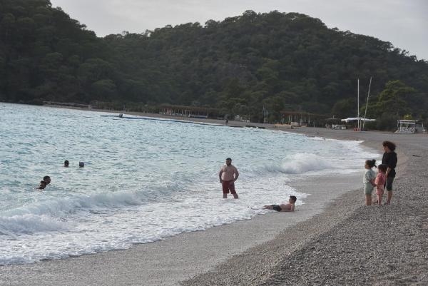 MUĞLA'nın Fethiye ilçesinde, rüzgarlı havaya ve dalgalı denize rağmen bazı yabancı turistler denize girdi.